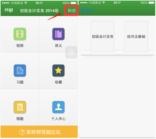 3:點(diǎn)擊右上角“科目”,可以進(jìn)行科目切換,初級(jí)會(huì)計(jì)實(shí)務(wù)、經(jīng)濟(jì)法基礎(chǔ)。