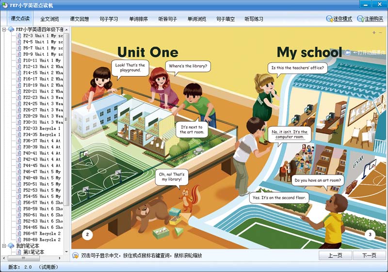 PEP小學(xué)英語點(diǎn)讀機(jī)(三年級下冊)根據(jù)人民教育出版社2012年最新出版的課本配套開發(fā)完成,是一款專門針對PEP小學(xué)英語的輔助學(xué)習(xí)軟件,該軟件與教材完全同步,有清晰的圖片和英語讀音,主要提供點(diǎn)讀功能和動畫互動模塊,讓小學(xué)生不僅能看到全彩的課本畫面,而且能點(diǎn)哪里哪里發(fā)音,可以有效激發(fā)學(xué)習(xí)興趣,提高英語聽說能力,為孩子將來的英語學(xué)習(xí)打下良好的基礎(chǔ)。