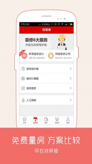 ★找裝修:免費(fèi)量房設(shè)計(jì),免費(fèi)監(jiān)理服務(wù),最精準(zhǔn)的方案預(yù)算,拒絕預(yù)算浮動(dòng)!★買材料:無需奔波各個(gè)裝修賣場,“動(dòng)動(dòng)手指”輕松買到全網(wǎng)最低價(jià)建材!