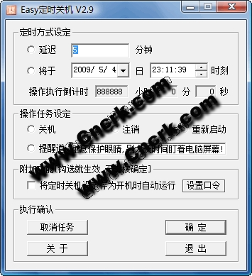 Easy定時關機精靈 V2.9 簡體中文綠色免費版 Easy定時關機精靈 是一款運行于Windows系統的定時關機得力助手。具有延遲一定時間或在設定的時間執(zhí)行關機、重新啟動、注銷功能;此外還有開機自動運行,定時提醒和關機倒計時顯示的功能。軟件界面漂亮友好,簡單易用。此為免費綠色軟件,無須安裝可直接運行,歡迎使用