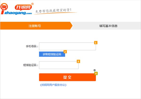 2、填寫手機號碼,并點擊獲取驗證碼,找鋼網將向您的手機發(fā)送一條短信;在您收到短信后,將短信中的驗證碼填寫到頁面中,并同意《找鋼網用戶服務協(xié)議》后點擊提交,即可進入下一步。