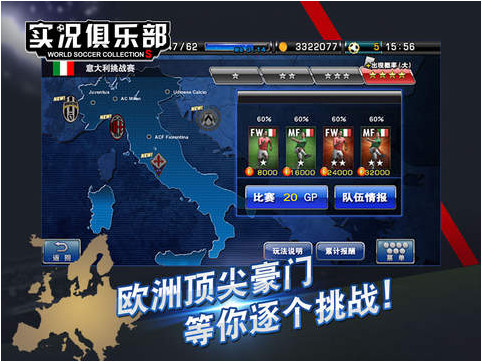 游戲中有1500多名世界各國球隊的球員,玩家可以通過在游戲比賽中獲勝或是完成游戲任務來獲得這些明星卡片,游戲中還有一個非常有特色的就是玩家可以通過球探來幫你尋找實力更強的球星。