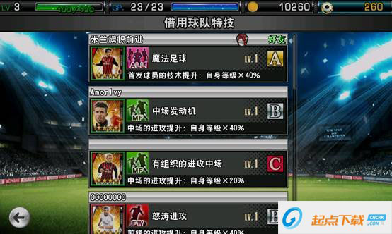 比賽開始前,可以借用其他人的球隊技能,如果是好友的話,比賽結束后可獲得友情點,如果不是好友的話,比賽結束后可以發(fā)出好友申請。