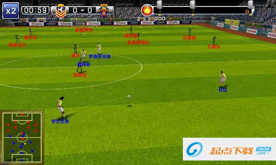 比賽時,自己球隊的球員以藍字顯示,對方球員以紅字顯示。自己球隊的球員控球時,球員會顯示在屏幕左上方,對方球員則顯示在右上方。