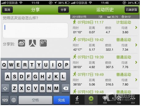 在運(yùn)動(dòng)完成后,會(huì)彈出分享的對(duì)話框,你可將本次運(yùn)動(dòng)的數(shù)據(jù)分享到新浪微博,人人網(wǎng),騰訊微博。首次使用的需要輸入賬號(hào)密碼。在文本框中輸入文字也可以不填,選擇右上方的“分享”。一旦出現(xiàn)分享不成功的情況??梢赃x擇底部菜單欄中的“歷史”,這里按時(shí)間排序顯示所有的運(yùn)動(dòng)記錄,為分享成功的會(huì)有感嘆號(hào)的標(biāo)志,選擇“云端獲取”或選中這次運(yùn)動(dòng)后,可以查看詳情并重新選擇右上方的”分享“鍵開(kāi)始分享。