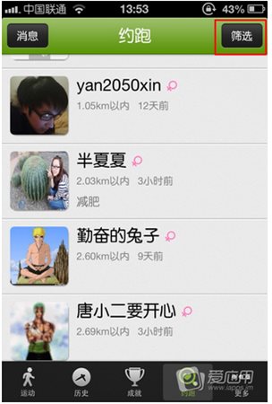 在查看用戶的右上方還有一個(gè)“篩選”按鈕,可以根據(jù)用戶的性別和偏愛(ài)運(yùn)動(dòng)類型對(duì)“道友”進(jìn)行篩選。