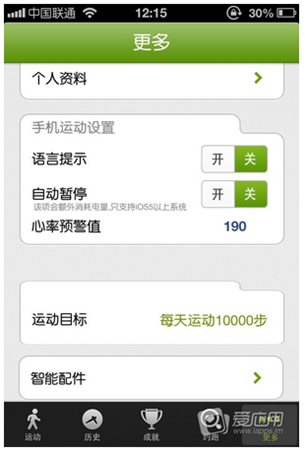 選擇菜單欄底部的設(shè)置按鈕,可對(duì)個(gè)人資料,運(yùn)動(dòng)目標(biāo),手機(jī)運(yùn)動(dòng)等進(jìn)行設(shè)置,在個(gè)人資料中可更改自己的身高體重,運(yùn)動(dòng)愛(ài)好等,運(yùn)動(dòng)目標(biāo)選項(xiàng)則比較奇怪,你可以在此設(shè)定步數(shù),距離,消耗熱量的目標(biāo)值,但是在實(shí)際使用過(guò)程中卻沒(méi)有發(fā)現(xiàn)有任何體現(xiàn)。另外,在運(yùn)動(dòng)過(guò)程中,你可以開(kāi)啟或關(guān)閉語(yǔ)音提示,語(yǔ)音提示內(nèi)容為,每跑步一公里會(huì)提示耗時(shí),均速等,需要關(guān)閉的話,將語(yǔ)音提示按鈕關(guān)閉即可。