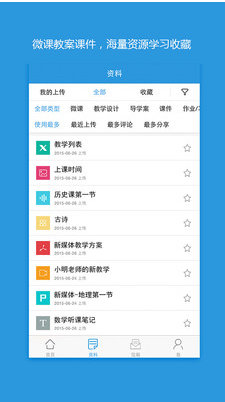 資源管理:提供豐富的資源,包括微課,教學(xué)設(shè)計,導(dǎo)學(xué)案,課件等。對我上傳的資料進(jìn)行在線管理,同時可以查看到他人的資料,支持對他人資料進(jìn)行收藏,方便日后學(xué)習(xí)。