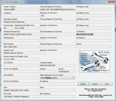 GVG Info(formerly PC Info) V3.9 英文綠色免費(fèi)版 計(jì)算機(jī)系統(tǒng)配置的檢測(cè)軟件??梢詸z測(cè)到computer ID, CPU, BIOS, 內(nèi)存, CD-ROM, 硬盤, 顯示卡, 聲卡, 網(wǎng)卡和網(wǎng)絡(luò)設(shè)施, modem, 主板, 顯示器, 鼠標(biāo), 打印機(jī), 主機(jī)IP地址 以及 MAC 的相關(guān)設(shè)置等信息