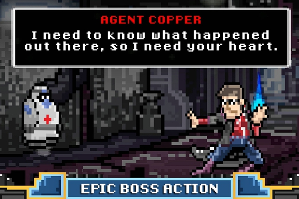 和仿Gameboy風格《尋鴿者》或者《2-bit牛仔》不一樣,《機器人逃亡》是一個風格更近似于紅白機或街機的橫版射擊過關(guān)游戲(開始游戲需要投幣喲)。總體來說,《機器人逃亡》的劇情比較慢熱,玩起來尚算過癮,當然,最大的亮點,就是那群神經(jīng)兮兮的開發(fā)者了。