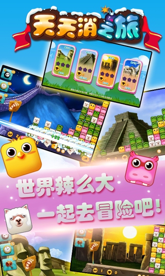 《天天消之旅》是具有清新動漫風(fēng)的益智休閑類手機(jī)游戲。相傳在世界各地的遺跡里面,隱藏著一只神秘的邪惡之風(fēng)。這股邪惡之風(fēng)會將遺跡里面的小動物不斷的推向懸崖。身為正義的你,趕緊伸出你的上帝之手,使出各種魔法道具,將小動物從危險之中拯救出來吧!當(dāng)你拯救的小動物越多,你能夠激活的星星封印就越多。當(dāng)你激活3顆星星封印時,將能夠?qū)⒃撎幍男皭褐L(fēng)永久鎮(zhèn)壓,還小動物們一個美好的世界!