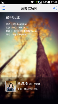 微名片是基于移動互聯(lián)網(wǎng)和二維碼技術(shù)的手機名片,每一張微名片都擁有唯一的網(wǎng)址和二維碼,打開瀏覽器就能查看分享名片,擁有完善的便捷的名片信息交換、分享功能,實現(xiàn)一鍵保存名片信息至手機通訊錄。微名片-手機名片,商務(wù)人士的電子名片。為您提供網(wǎng)商時代網(wǎng)絡(luò)身份識別,助您生意一臂之力。可移動的名片,微商或是網(wǎng)絡(luò)必備的名片之一,是名片中的極品,是名片中的“紳士”。是現(xiàn)代政要和企業(yè)老板身份的象征。微名片不但新穎,時尚,而且非常實用,適用于任何商家,企事業(yè)。微名片是名片中的極品,是名片中的“紳士”。是現(xiàn)代政要和企業(yè)老板身份的象征。是今后企事業(yè)單位必備的宣傳品【軟件特點】