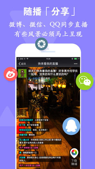 -高質量的視頻直播,隨時隨地向朋友展示你的精彩。-將直播分享到微博、微信和QQ,你的朋友可以立即與你互動。