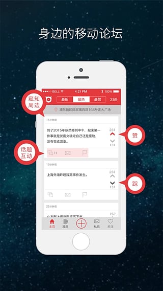 無(wú)論是在校園、大公司、城市CBD、生活社區(qū)、體育比賽場(chǎng)館、大型活動(dòng)所在地等各類(lèi)熱鬧的地方,你可以隨時(shí)的使用“微現(xiàn)場(chǎng) ”,自由地與你本地周?chē)娜朔窒?,瀏覽周?chē)藗兯此耄私庵車(chē)藗兊母鞣N秘密,參與周?chē)藗兊脑掝}討論,和你感興趣的人私信交流。