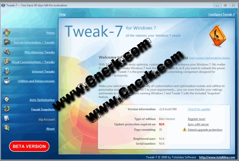 Tweak-7 V1.0 Build 1115 英文官方安裝版 是TotalIdea推出了Windows Vista調(diào)整優(yōu)化軟件,它可以調(diào)整Vista中上百個隱藏選項(xiàng),優(yōu)化和個性化你的機(jī)器.而Tweak-7則是TotalIdea針對Windows 7推出新調(diào)整優(yōu)化軟件!