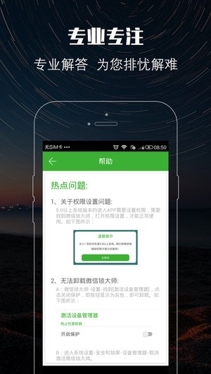 微信鎖助手app是一款隱私偽裝保護(hù)衛(wèi)士,微信鎖助手app專注鎖定手機(jī)軟件隱私空間,對(duì)信息安全實(shí)現(xiàn)前“鎖”未有的加密保護(hù)。即使親朋好友、同事把玩你手機(jī),也可以很好的偽裝,不用擔(dān)心會(huì)泄露你的手機(jī)聊天記錄、朋友圈、支付及紅包等隱私信息!【功能介紹】