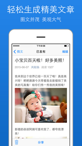 - 批量導(dǎo)入圖片,任意位置添加文字,隨意調(diào)整圖片和文字位置。- 單篇微文支持多達(dá)50張照片、50000字。