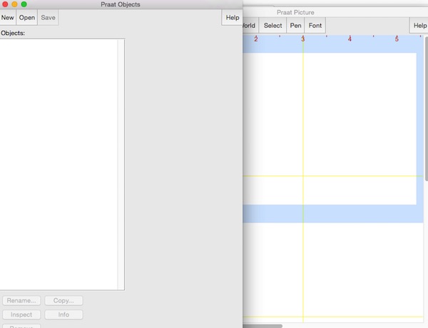 Praat程序由外圍與核心兩層構(gòu)成。外圍主要包括對(duì)象窗口(Object window,標(biāo)題為Praat objects)、畫(huà)板窗口(Picture window,標(biāo)題為Praat picture)、腳本編輯器(ScriptEditor)、按鈕編輯器(ButtonEditor)、數(shù)據(jù)編輯器(DataEditor,無(wú)固定標(biāo)題)、情報(bào)窗口(Info window)和手冊(cè)(Manual)等不負(fù)責(zé)具體的信號(hào)處理任務(wù)的輔助性組件。Praat每次啟動(dòng)時(shí),自動(dòng)打開(kāi)對(duì)象窗口和畫(huà)板窗口。對(duì)象窗口也是Praat的主控窗口,在Praat程序的會(huì)話進(jìn)程中始終打開(kāi),大部分功能也需要由此展開(kāi)。腳本(script)在是Praat中執(zhí)行各種操作的宏命令,能夠簡(jiǎn)化日常操作,減少出錯(cuò),并實(shí)現(xiàn)大量復(fù)雜操作的自動(dòng)化。按照作者的最初設(shè)想,除了Praat之外還會(huì)有其他程序使用與Praat相同的外圍程序,但多年來(lái)一直沒(méi)有實(shí)現(xiàn)。