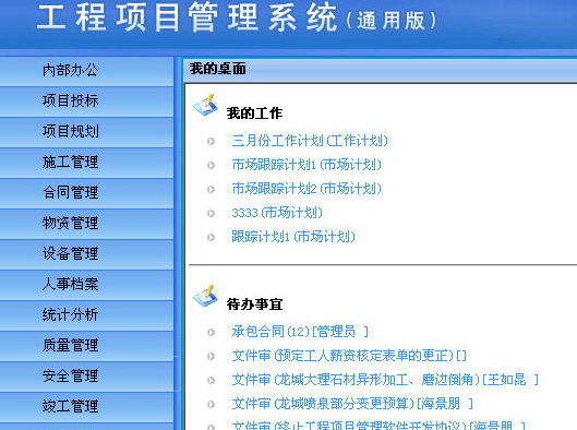 建筑工程項目管理軟件主要功能包括:投標管理、項目信息,項目計劃、材料管理、人事管理、設(shè)備管理、施工管理、資金管理、合同管理、知識管理、成本管理、分包管理、企業(yè)辦公(OA)管理、輔助決策(領(lǐng)導(dǎo)報表查詢)、系統(tǒng)管理等功能。