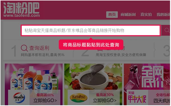 第一步:復(fù)制您想要購(gòu)買的淘寶商品標(biāo)題粘貼到淘粉吧網(wǎng)站首頁(yè)的搜索框查詢返利