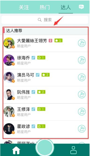 3、我們?cè)冱c(diǎn)擊最上方的達(dá)人按鈕,即可觀看各位明星達(dá)人,你可以選擇關(guān)注你喜歡的明星,同時(shí)還可以觀看明星的直播信息喲。