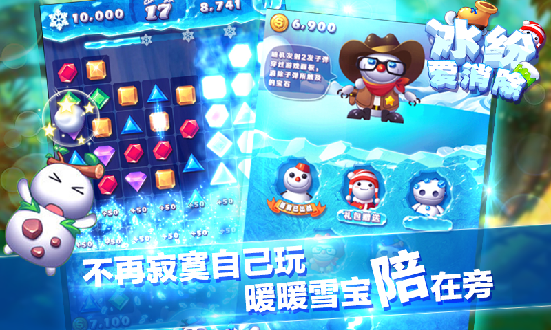 1、超萌雪人寵物前來助戰(zhàn),不同的雪人寵物擁有不同的技能。它們可以在游戲中幫助玩家消除寶石,輕松橫推關(guān)卡。