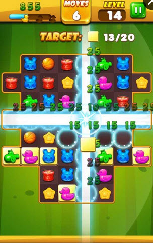 游戲玩法:在規(guī)定的時間或者步數(shù)內(nèi),匹配三個或者更多的玩具進行消除,分數(shù)到達游戲的要求就可以進入下一個關(guān)卡。