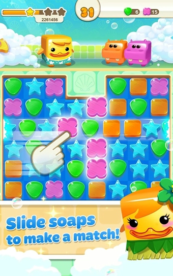 ● 考研腦力的全新三消游戲!在充滿挑戰(zhàn)的迷陣中滑動香皂!● 制造皂瓶炸彈,點擊它們顯現(xiàn)威力