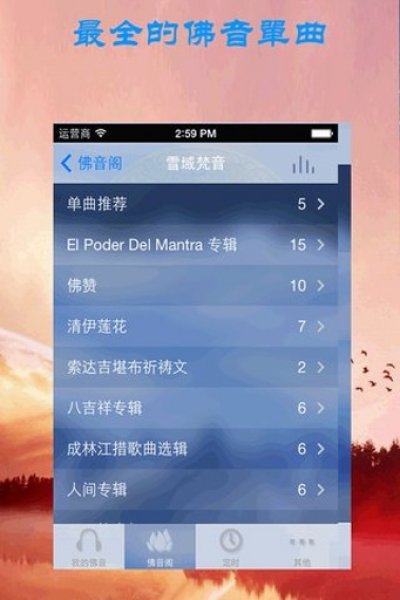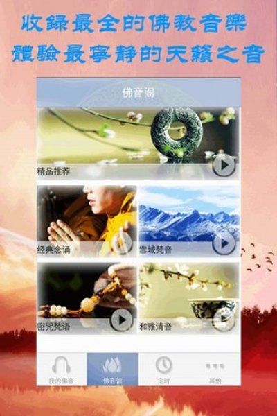 細(xì)心的定時(shí)設(shè)置,早晚課自動(dòng)音樂(lè)提醒,讓您更易親近佛法。為您提供最全面的佛教音樂(lè),經(jīng)典經(jīng)文念唱
