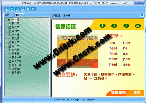 兒童英語一點通之動畫學音標2009主要功能是以flash動畫的方式來教學發(fā)音規(guī)則、重音規(guī)則、單元音、雙元音、輔音發(fā)音等五大部分內(nèi)容。本軟件使用簡單,女聲真人發(fā)音,非常悅耳動聽;動畫教學,趣味性強,很適合希望糾正英語發(fā)音的朋友,也很適合用來教兒童學英語