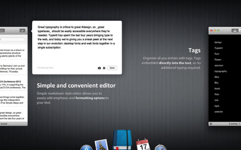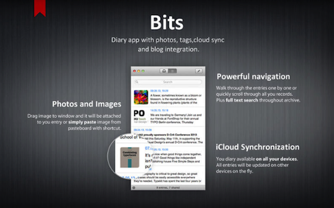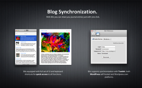 Bits for Mac是一款小巧的筆記工具,用它來(lái)記錄生活中的點(diǎn)點(diǎn)滴滴剛剛好,Bits for Mac沒有冗余的功能和矯情的服務(wù),完全免費(fèi),用戶可以用tag來(lái)分類日志,對(duì)文本進(jìn)行簡(jiǎn)單的編輯,還能插入圖片,同時(shí)還能將內(nèi)容同步到Wordpress博客或是Tumblr。Bits for Mac作為一款小的軟件不需要占用你桌面上的太多空間,它能在你任何有想法的時(shí)候使用,保留你的靈感。它也支持圖片的插入,結(jié)合良好的分享功能隨時(shí)隨地共享好友。【軟件特點(diǎn)】