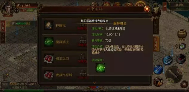每天中午下午吃飯的時候,膜拜城主活動開啟,吃飯之前到比奇城安全區(qū),點下城主進行膜拜,就可以站著混經(jīng)驗了。