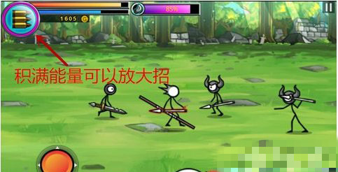 大招是主角火柴人拿起弓箭,用火箭連射敵人。通常情況下,使用大招是會消耗能量的,在能量消耗盡的時候,主角就會停止射火箭,要等下一次能量滿了才能再放大招。
