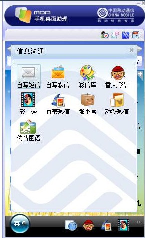 中國移動(dòng)手機(jī)桌面助理作為用戶手機(jī)在 PC 桌面上的“映射”,它提供大量能夠在 PC 桌面輔助用戶使用手機(jī)的功能,如真實(shí)號碼的短信彩信發(fā)送、定時(shí)信息發(fā)送、手機(jī)事務(wù)提醒、手機(jī)通訊錄管理、特色彩信、短信和彩信數(shù)據(jù)庫調(diào)用,配合手機(jī)服務(wù)的指南信息,天氣菜譜酒店等日常便捷服務(wù)等。