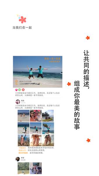 一路花開(kāi)安卓版打造的一起回憶,才是最美的回憶。每一個(gè)參加者都可以在故事里添加自己的文字和照片。眾人的不同視角和內(nèi)容,使故事更加的完整和豐滿。