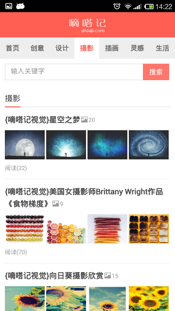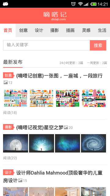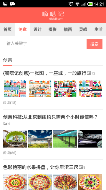 嘀嗒記有創(chuàng)意、設(shè)計(jì)、攝影、插畫、生活、靈感六個(gè)分類。嘀嗒記旨在分享創(chuàng)意,分享生活中的創(chuàng)意科技、創(chuàng)意家居、創(chuàng)意設(shè)計(jì),希望我們的網(wǎng)站能提高您對(duì)設(shè)計(jì)的感知,能讓你積累。【軟件特點(diǎn)】