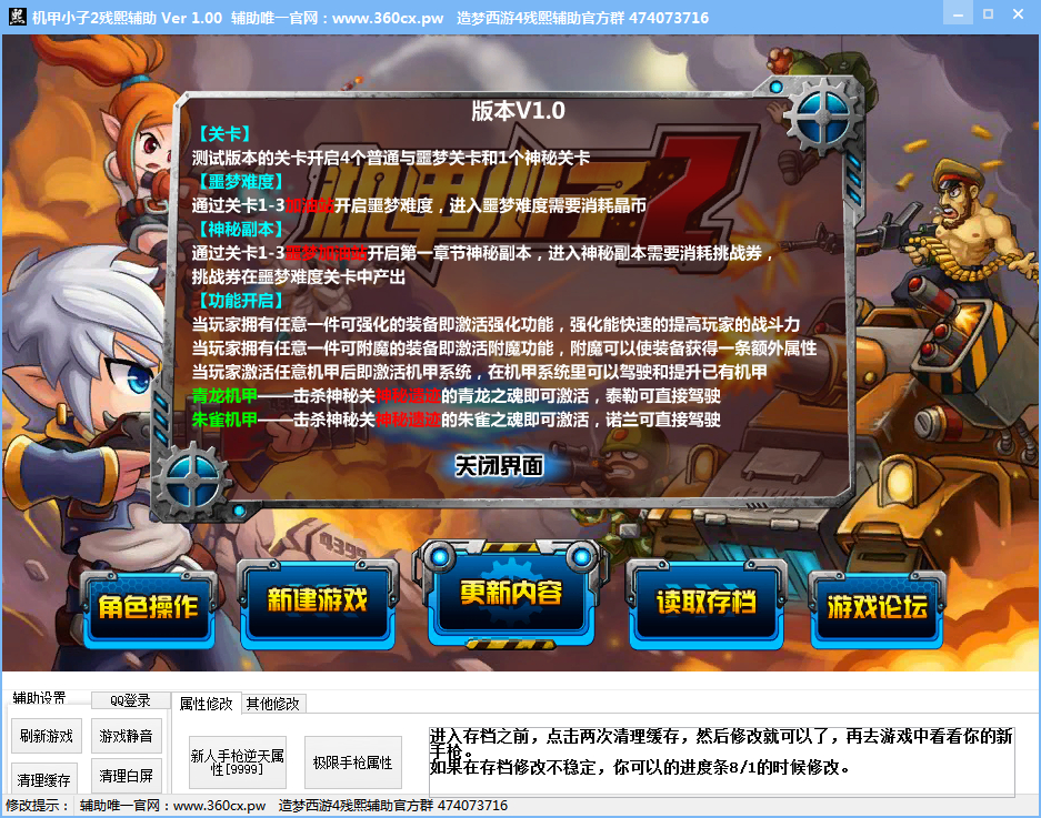機甲小子2殘熙輔助是一款適用于游戲《機甲小子2》的輔助工具,該工具刷新游戲,游戲靜音,極限手槍屬性,清除游戲緩存等實用功能,是您玩機甲小子的必備工具。