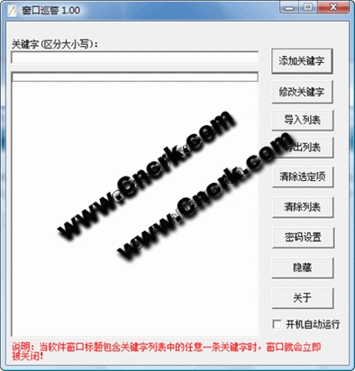 窗口巡警以監(jiān)控窗口標(biāo)題來達(dá)到管理窗口的目的,通過設(shè)置適當(dāng)?shù)年P(guān)鍵字可以自動(dòng)關(guān)閉一些存在不良信息的窗口,防止某些人瀏覽一些含有不良信息的網(wǎng)站(如色情網(wǎng)站等)。本軟件可以設(shè)置密碼,防止他人隨意修改關(guān)鍵字,同時(shí)它還具有隱藏、開機(jī)自動(dòng)運(yùn)行的功能,可以實(shí)現(xiàn)一勞永逸.