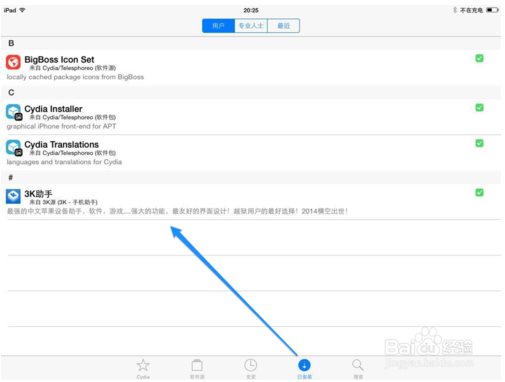 3K助手安裝前需安裝Cydia1、點擊打開桌面上的【Cydia】