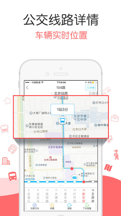 地圖上查看動(dòng)態(tài)的移動(dòng)公交,還原行駛情況。得知公交車在線路上的位置、到站時(shí)間、行駛方向,還可以了解到公交車運(yùn)行時(shí)間段。信息詳實(shí)齊全,地圖上查看更加直觀明了。