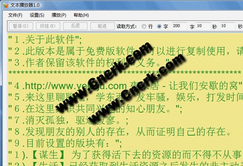 文本播放器 V1.0 簡體中文綠色免費版 利用這個軟件 ,你可以非常享受于閱讀小說,乃至于枯燥的解說文檔??梢栽O(shè)置播放速度,調(diào)整閱讀時的各種設(shè)置,比如想躺在床上看,那么可以把字體調(diào)到72,背景色調(diào)暗些,字體顏色調(diào)淡些