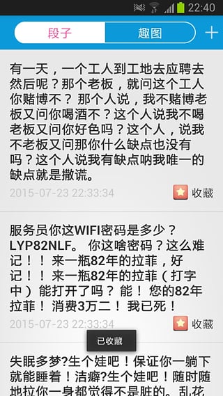 一款生活休閑類的應(yīng)用,包括搞笑的段子和捧腹趣圖,讓你在繁忙的生活中,在無(wú)聊的時(shí)候也可以停下來(lái)樂(lè)呵樂(lè)呵,放松心情。【軟件特點(diǎn)】