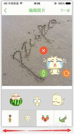 4、進(jìn)入在下一步后,就會看到很多的貼紙,左右晃動貼紙專題,挑選喜歡的貼紙貼在照片上;貼紙可以放大縮小,更改左右調(diào)換,取消等操作來滿足需求;貼好貼紙后,點(diǎn)擊“下一步”