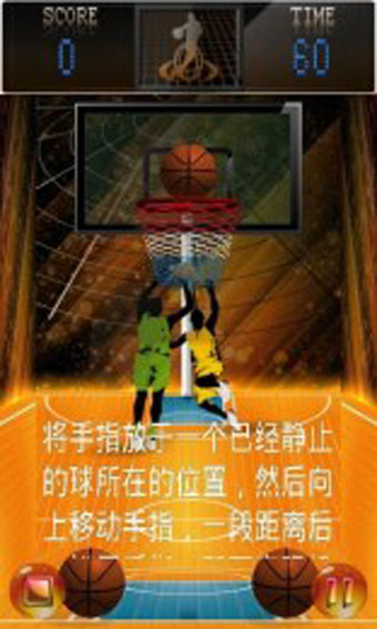 熱火籃球是一款以籃球?yàn)轭}材的體育類游戲。用您的指尖來(lái)打籃球,瞄準(zhǔn)投籃,每場(chǎng)時(shí)間限制為1分鐘??靵?lái)一起試試吧!用""掃動(dòng)""手勢(shì),手指放在球上以后掃向你想要的方向即可,球的速度是和動(dòng)作的速度相關(guān)的。