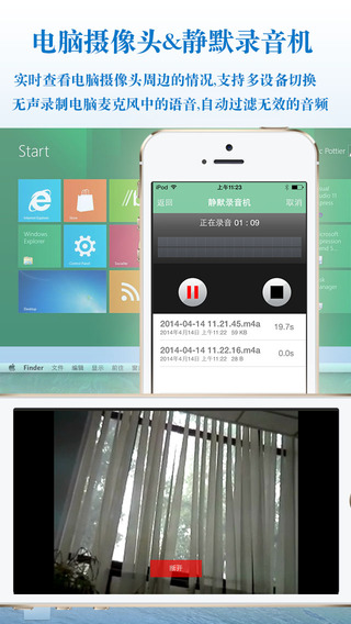 - 與電腦連接后,可直接遠(yuǎn)程開(kāi)啟您電腦上的攝像頭和麥克風(fēng),把圖像和聲音實(shí)時(shí)傳輸?shù)絠Phone和iPad上,這樣您可以在辦公室或者在外出的時(shí)候, 隨時(shí)看到家里發(fā)生的一切.再也不用擔(dān)心家中的baby出現(xiàn)狀況,當(dāng)然也可以看看家中的狗狗都在干什么 :-)