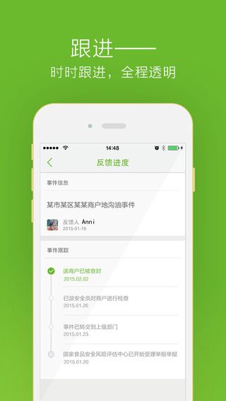 3、設(shè)立智能安全員小安,及時(shí)推送食品安全隱患事件預(yù)警。您也可以隨時(shí)隨地向小安反映身邊的食品安全事件。要知道您關(guān)注的就是國(guó)家關(guān)心的,更是全社會(huì)需要的;