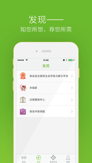 4、食事求是App整合國(guó)家食品安全最優(yōu)資源,為您提供標(biāo)準(zhǔn)、專(zhuān)業(yè)的食安知識(shí)。