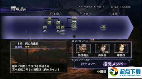 本作中獨特的選關(guān)畫面,注意某些關(guān)卡是有改于不改之分的哦,比如某個救黃忠的關(guān)卡一開始是沒有改變的,所以他必死無疑,當(dāng)取得某個道具或者人物之后該關(guān)卡變成改后再進(jìn)去就可以順利的救出他了。在出擊的時候一般都有該關(guān)卡的推薦角色,其實這個要素一開始無視即可,以后要練友好度什么東西在選也可以,反正這個游戲就是刷、刷、刷!