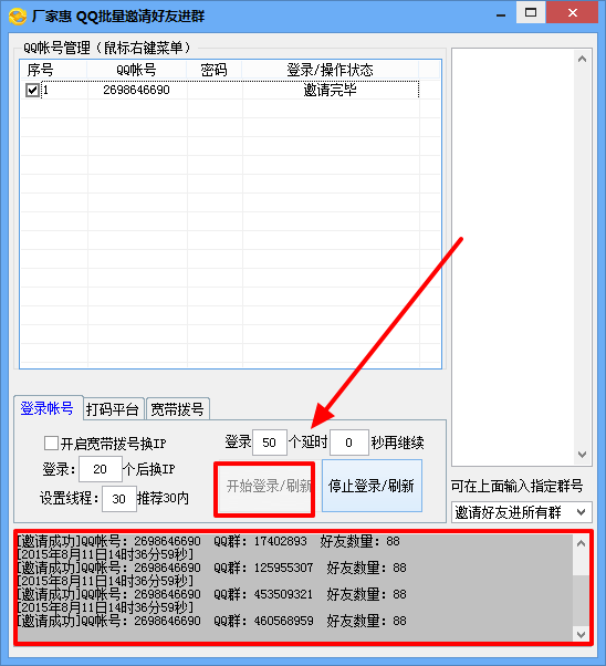 QQ批量邀請好友進群軟件是一款免費軟件功能,批量登錄QQ,批量邀請QQ好友進群,注意:登錄的QQ必須在群中才能邀請哦!而且群開放邀請的情況下!