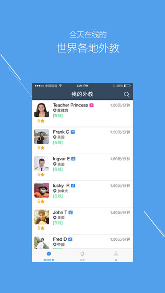 老外趣聊app是一款實(shí)現(xiàn)中外無阻礙交流的聊天社交學(xué)習(xí)軟件。在這里,有最便宜、最純正的外交資源,全天在線的世界各地外教,為你一對一真人外教視頻口語學(xué)習(xí),讓你可以快速學(xué)習(xí)外語知識,從而輕松與老外對話。